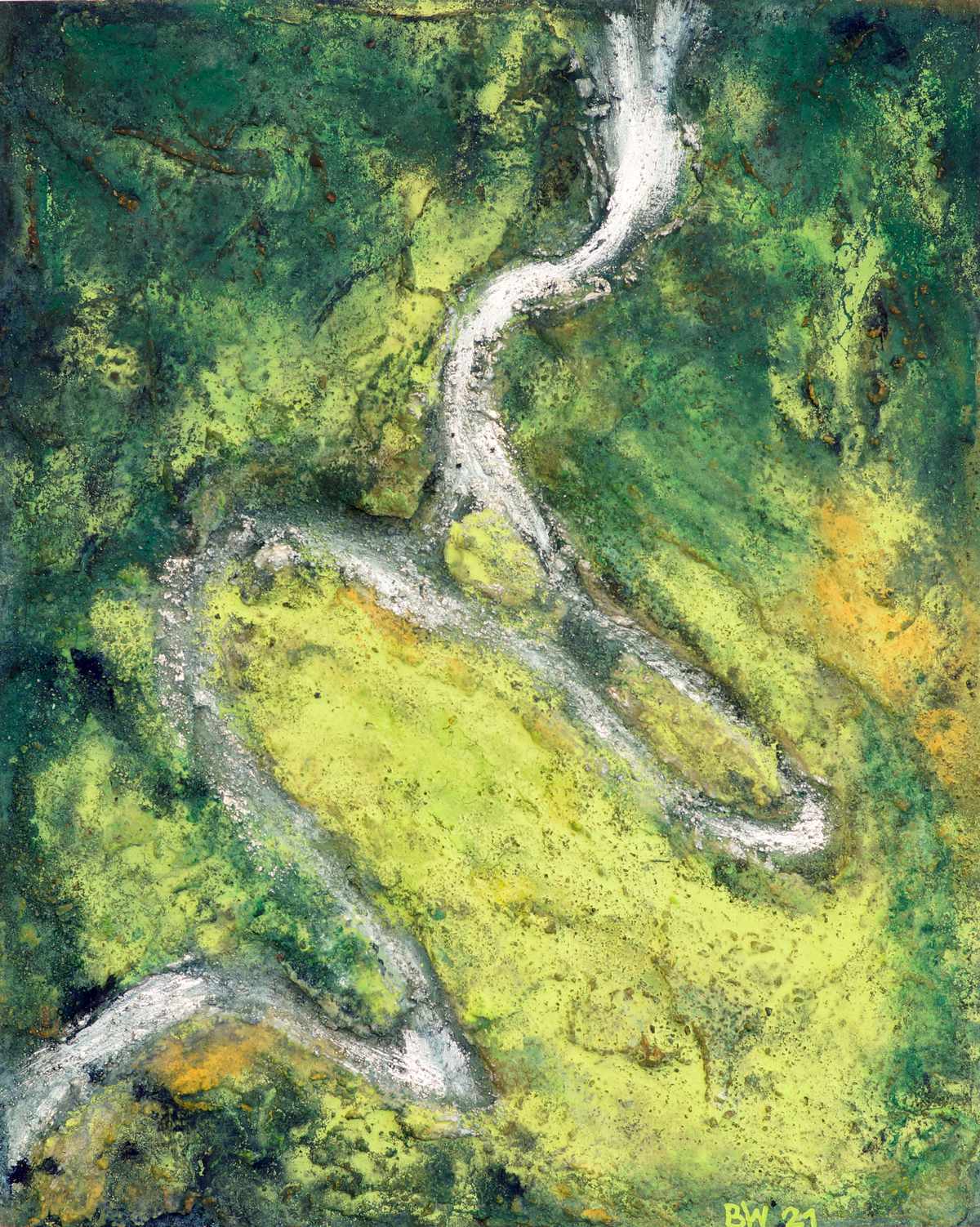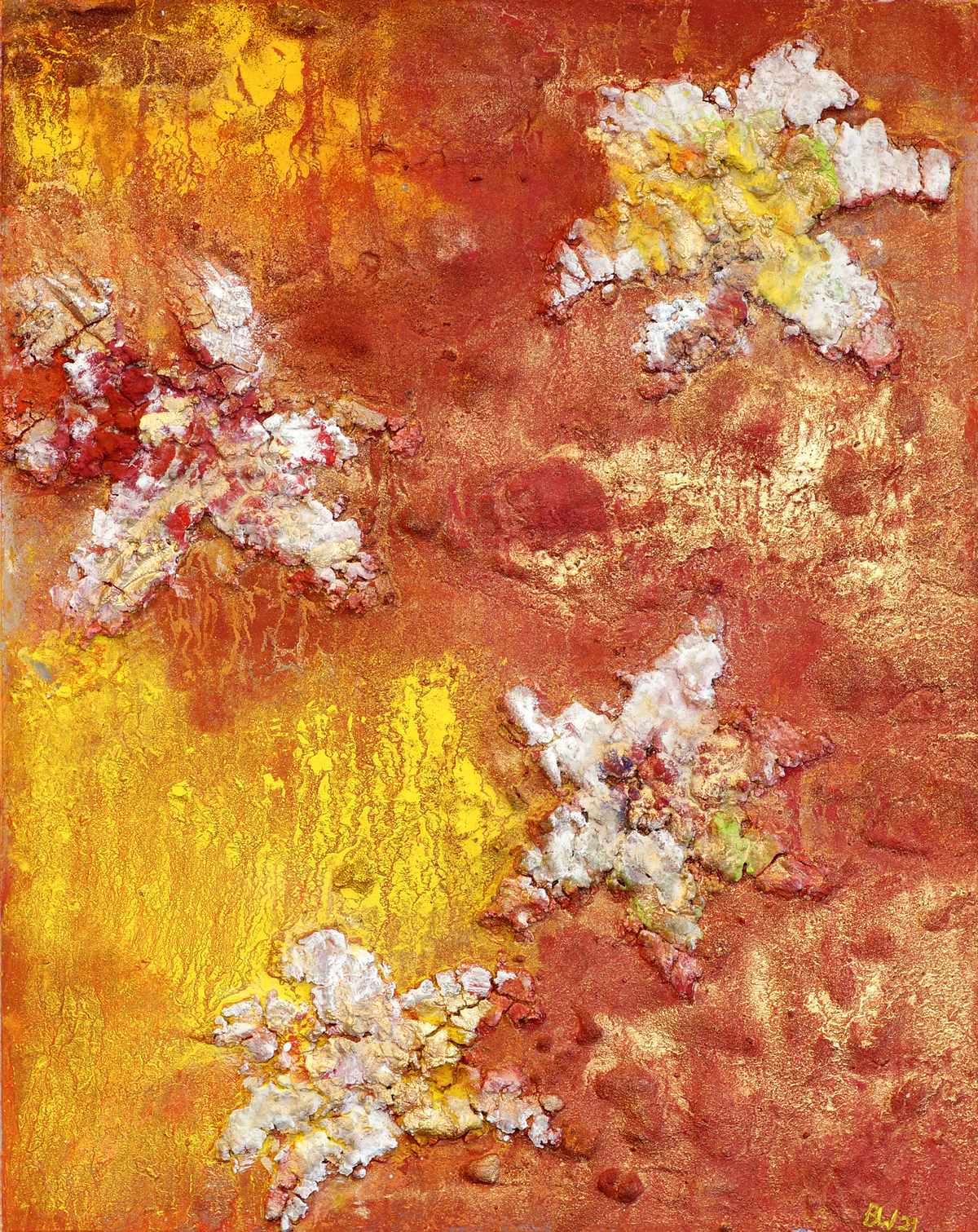 Die Bilder wurden auf Acrylglas gemalt. Dadurch bekommt das Bild in seinem Ausdruck etwas Schwebendes und Leichtes, das auch in der Poesie Ausdruck findet.