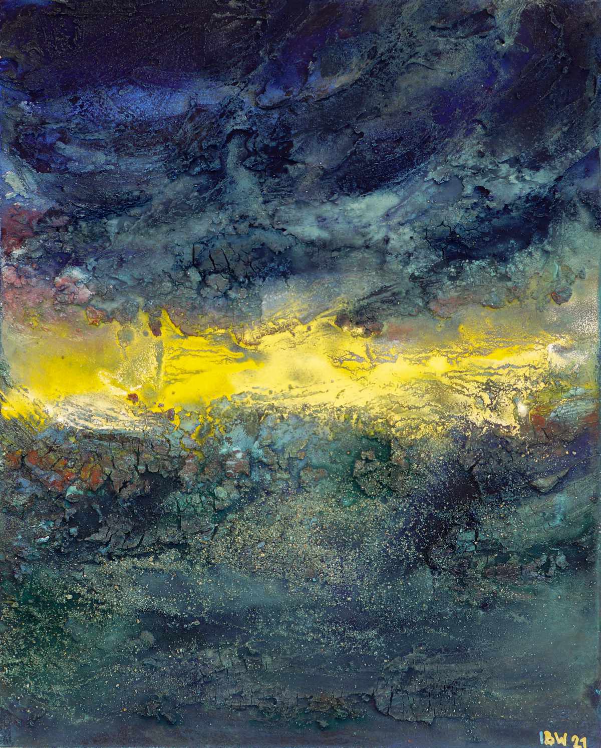 Das Bild ist insgesamt noch in Dunkelheit getaucht. Durch das aufbrechende Licht (der gelbe Streifen in der Mitte des Bildes) zeichnen sich die ersten Silhouetten ab und lassen die Farbenpracht erahnen, die sichtbar wird, wenn der Tag voll angebrochen ist. Die dunklen Blautöne und Grüntöne, sind Zeichen der Hoffnung.
